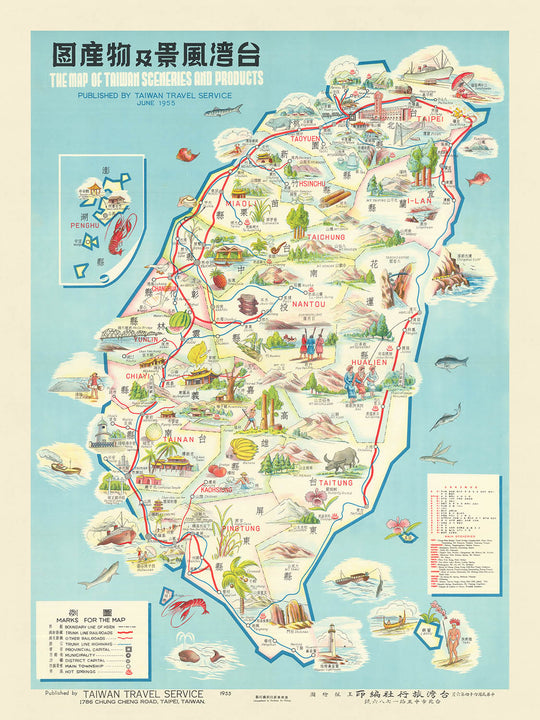 En conclusion, La carte des paysages et des produits de Taïwan est plus qu'une simple aide à la navigation ; c'est un récit profond de l'attrait géographique et de la vitalité culturelle de Taïwan, capturé durant un moment clé de son histoire. Pour les collectionneurs, les historiens et les admirateurs de l'art cartographique, cette carte offre un mélange unique de beauté esthétique et d'insight historique, en faisant un bien précieux pour quiconque fasciné par la riche et complexe tapisserie du passé et du présent de Taïwan.