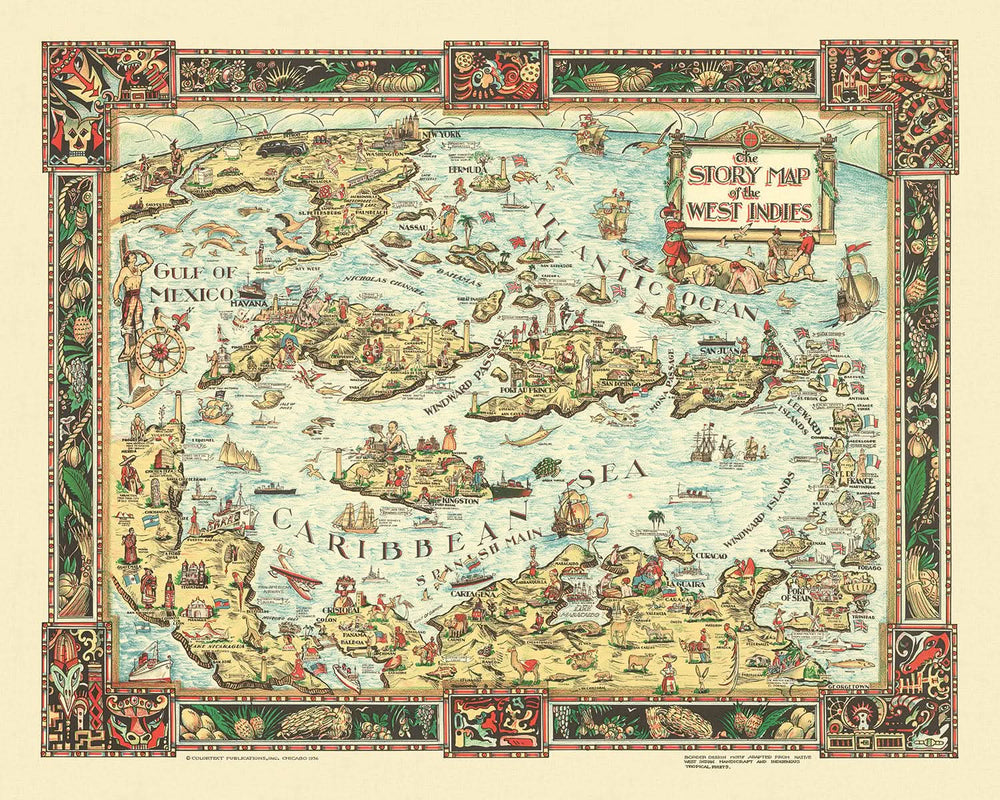 La carte des Antilles, réalisée en 1936 par Colortext Publications Inc., est un mélange captivant d'art et de cartographie. Cette carte picturale décorative capture avec vivacité l'essence des Caraïbes et de la Floride, offrant un aperçu de la mosaïque culturelle et historique de la région. Colortext, réputé pour ses cartes éducatives et visuellement attrayantes, imprègne cette pièce d'illustrations vibrantes et de détails complexes, reflétant la fascination de l'époque pour l'exploration et la narration.
