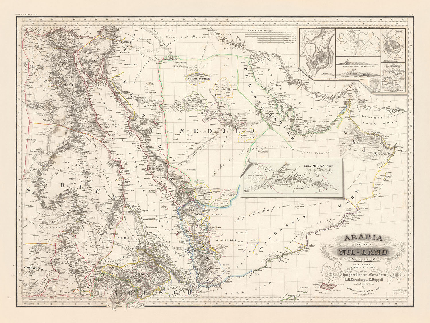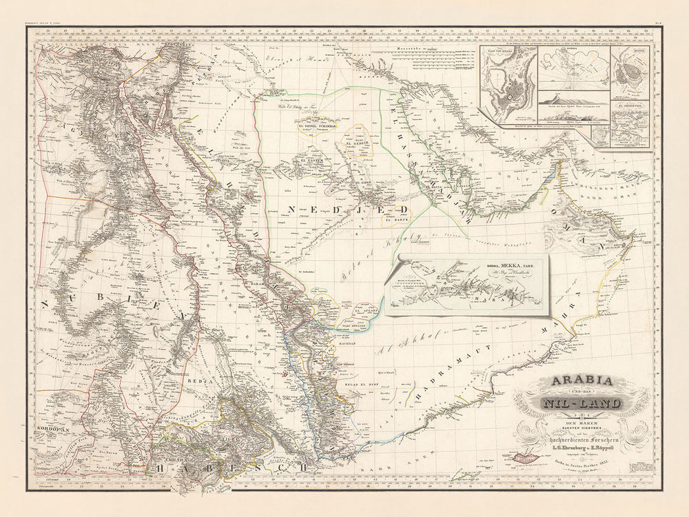 La carte s'étend du « Désert de Libye » à l'ouest jusqu'à « Ras-el-Had » à l'est, et du delta du Nil au nord jusqu'au « Lac Tanzanie » au sud. Il comprend plusieurs plans en médaillon de villes clés telles que Djeddah, La Mecque et Médine, ainsi qu'une illustration en trompe-l'œil de la route des caravanes de Djeddah à La Mecque et jusqu'à Taife. La représentation détaillée de ces régions offre un aperçu fascinant des routes commerciales historiques et de l'importance culturelle de ces villes au XIXe siècle.