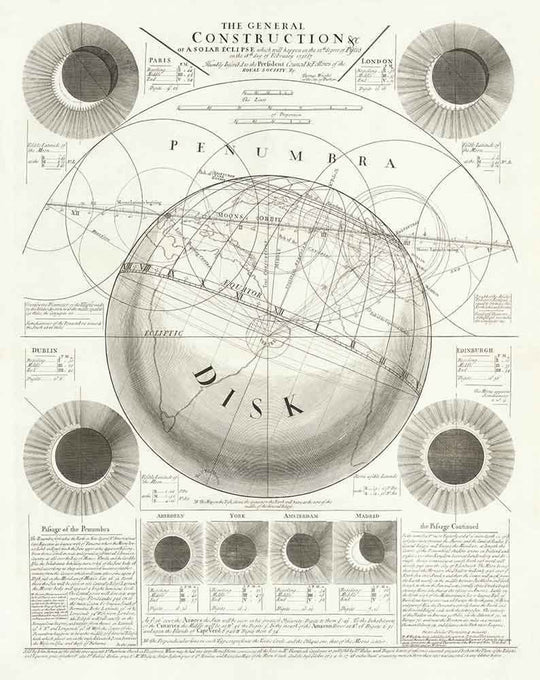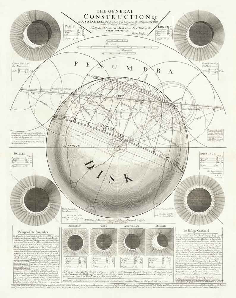 Un graphique fascinant et rare illustrant le chemin de l'éclipse solaire du 18 février 1737. Le graphique a été créé par l'astronome Thomas Wright et publié par John Senex, alors l'un des éditeurs les plus notables de matériels astronomiques.