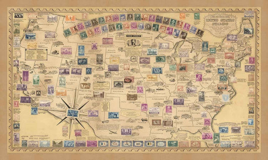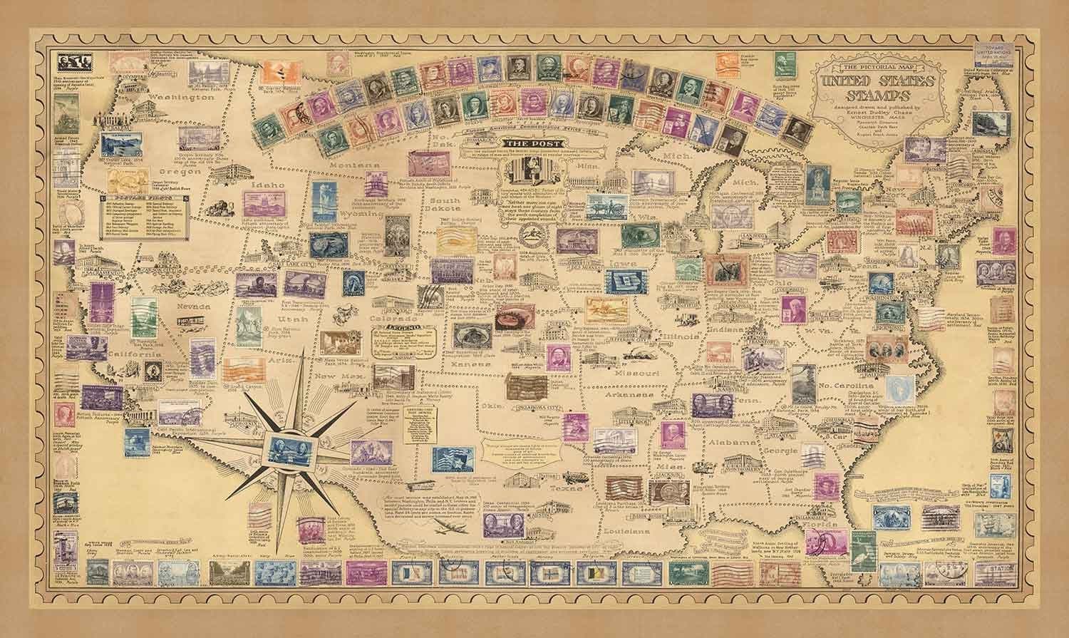 Cette carte plutôt unique des États-Unis d'Amérique, publiée à l'origine par Ernest Dudley Chase en 1949, présente des dizaines d'illustrations très détaillées de timbres-poste, principalement des années 1930 et 1940.