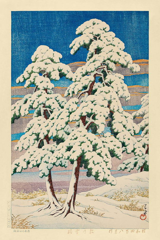 La notoriété de Les Pins Après la Neige réside dans son évocation sans effort de la sérénité. La composition place de grands pins stoïques contre un ciel bleu profond tandis qu'un tapis de neige recouvre le paysage, instillant un sentiment d'immobilité et de silence contemplatif. La capacité de Hasui à rendre la lumière hivernale, l'air frais et la majesté silencieuse avec grâce et subtilité fait de cette impression un exemple quintessentiel de son style, et un classique adoré parmi les collectionneurs d'estampes japonaises.