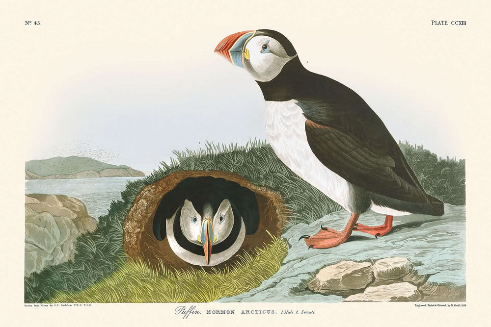 Puffin, une illustration d'oiseau captivante de John James Audubon, a été publiée pour la première fois en 1827 dans le cadre de son œuvre monumentale, The Birds of America. Cette œuvre majestueuse représente le charmant oiseau connu sous le nom de « perroquet de mer » le long des côtes est des États-Unis avec des détails exquis, capturant à la fois sa grâce et son riche habitat naturel.