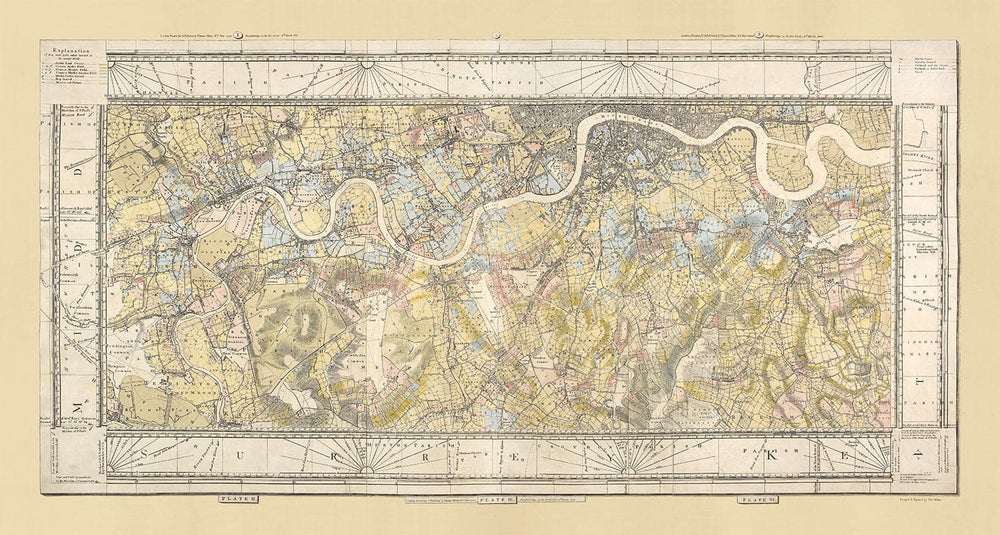 Ceci est une ancienne carte très décorative et extrêmement rare de Londres de 1799 par Thomas Milne. Il est présenté ici dans la forme personnalisée originale. Cette carte a été rétablie avec amour par la carte unique Co. à son atelier à Londres, mais il a toujours l'air délicieusement vieux et caractérisé.