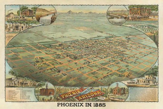 Cette carte est inhabituellement bonne pour une carte des yeux des oiseaux d'une petite ville en 1885. C'est probablement l'un des meilleurs points de vue des yeux des oiseaux jamais réalisés, et certainement la meilleure ancienne carte de Phoenix jamais publiée. C'est aussi la première carte de Phoenix. Fondamentalement ... c'est une carte incroyable.