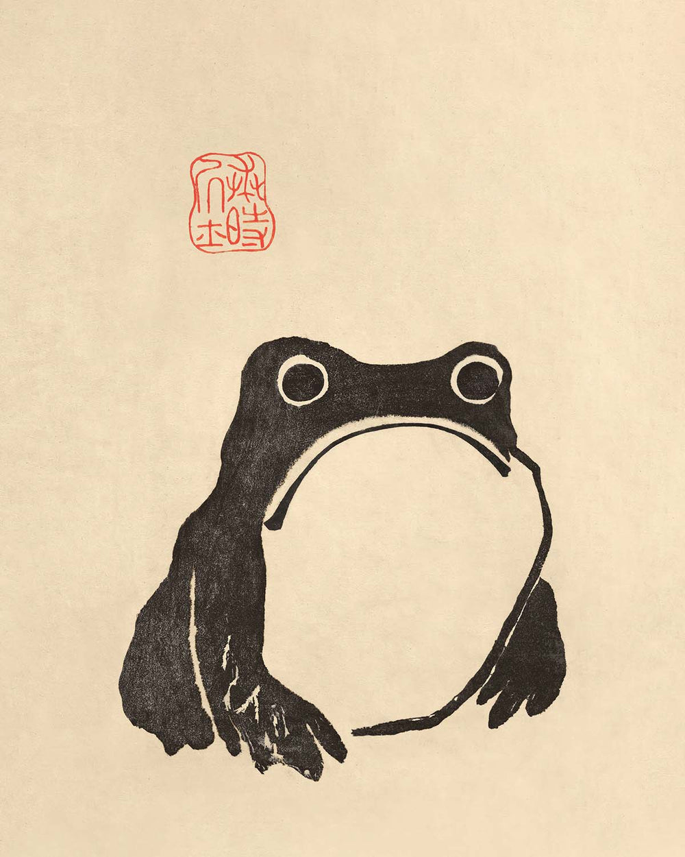 Cette estampe particulière est particulièrement remarquable pour sa qualité émotive. La grenouille, représentée avec un regard tourné vers le bas et une posture subtilement voûtée, transmet une mélancolie réfléchie. La simplicité de la composition amplifie l'impact émotionnel, invitant à la contemplation et à l'empathie. Avec une élégance minimaliste, l'artiste a réussi à capturer une expression universelle d'introspection, facilitant ainsi la connexion profonde des spectateurs avec cet amphibien.
