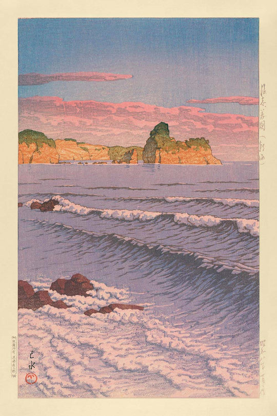 L'expertise de Hasui Kawase dans la création de paysages évocateurs est remarquable. Avec sa représentation magistrale de l'eau et des cieux, il apporte une atmosphère dynamique mais paisible à la vie, admirée par les collectionneurs et les passionnés d'art du monde entier. Cette pièce particulière, "Shinbeshi Bikuni Ocean Waves," met en valeur la capacité de l'artiste à fusionner des techniques traditionnelles avec une vision contemporaine, marquée par son contraste vibrant de violets et de roses, le tout dans des dégradés subtils, évoquant une scène océanique tranquille mais puissante.