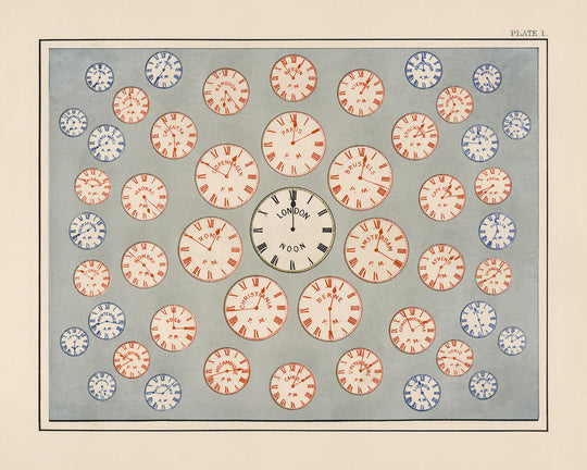 L'œuvre utilise une palette de couleurs subtilement belle, utilisant des teintes délicates pour différencier les différents fuseaux horaires. Le design astucieux invite les spectateurs à parcourir les villes du monde et à contempler les différences de temps—un précurseur de la normalisation des fuseaux horaires dans le monde. L'aspect intrigant des différences de temps non uniformes affichées sur les horloges fait de cette œuvre un sujet de conversation, ajoutant un élément de curiosité historique et de plaisir esthétique à n'importe quelle pièce.