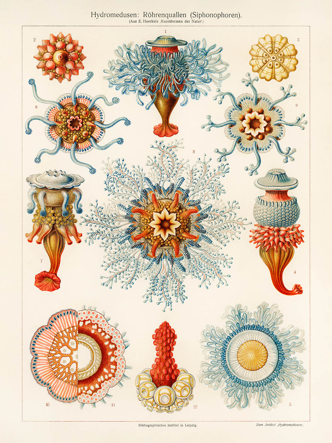 "Hydromedusen Rohrenquallen (Siphonophoren)" est une illustration exquise tirée de l'œuvre renommée d'Ernst Haeckel "Kunstformen der Natur" (Formes artistiques dans la nature), publiée pour la première fois en 1904. Cette œuvre présente une magnifique variété de méduses, méticuleusement détaillées pour capturer l'élégance et la complexité de ces créatures marines éthérées.