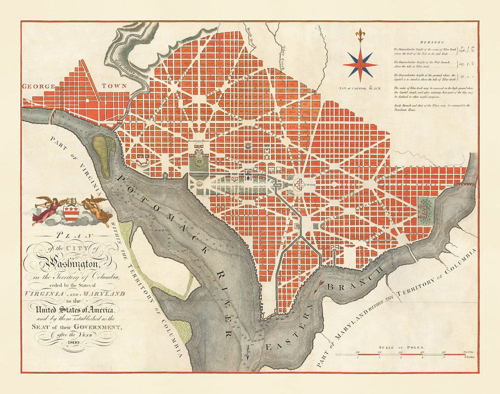 Le premier plan de dos de DC de DC a été mis en place en 1791 et les premiers plans officiels ont été publiés en 1792. Vous pouvez voir que la disposition moderne de la ville est remarquablement proche de l'original, plus de-220 plan antérieur.