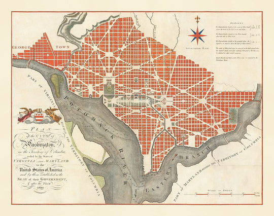 Très ancienne carte de Washington DC, 1795 de John Russell: Georgetown, Maison-Blanche, Capitole, Maison-Blanche, Plan de la ville