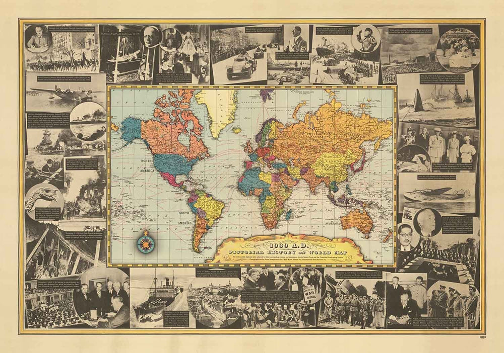 Les événements historiques clés montrés autour du bord de cette carte incluent la mort du pape Pie XI et le couronnement du nouveau pape nommé Pie XII.