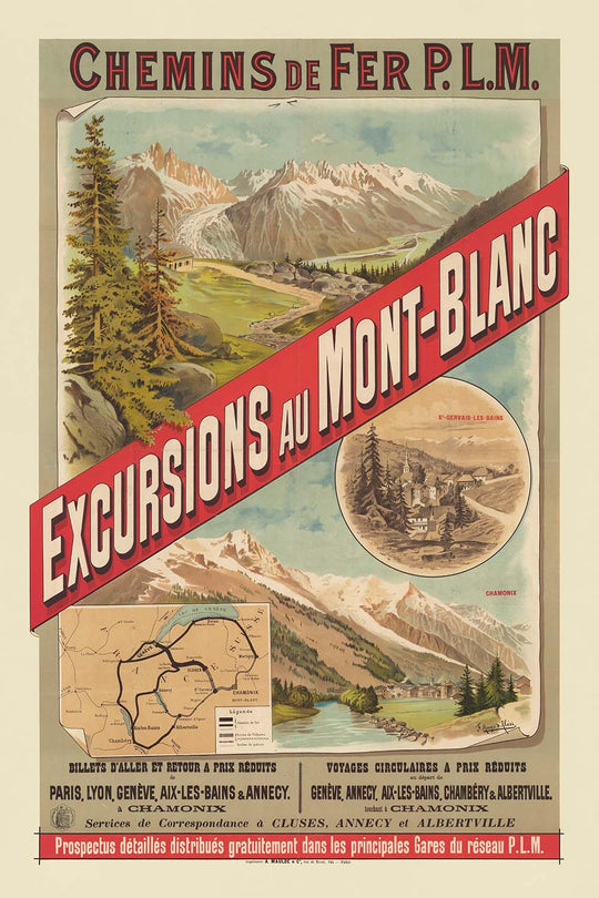 Chemins de fer P.L.M. Excursions au Mont-Blanc by F. Hugo d’Alési (1889) invites the viewer to the high Alps at the dawn of golden‑age rail tourism. Commissioned for the Paris–Lyon–Méditerranée railway, the poster promises easy access to Mont‑Blanc’s awe‑inspiring scenery. A sweeping red diagonal sash declaring “Excursions au Mont‑Blanc” cuts across painterly alpine vistas: serrated, snow‑bright peaks, green meadows dotted with boulders and firs, and a turquoise river winding toward a village labeled “Chamonix.” An inset roundel labeled “St‑Gervais‑les‑Bains” shows a spired church nestled among pines, and a small route map underscores the railway’s reach.