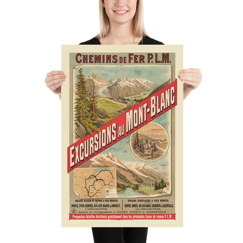 Chamonix Travel Poster: Chemins de fer P.L.M. Excursions au Mont-Blanc by F. Hugo d’Alesi, 1889