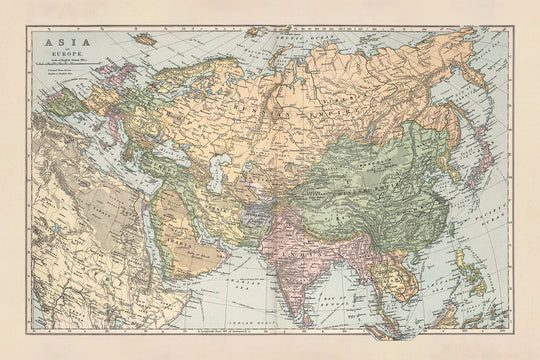 Plongez-vous dans la riche tapisserie de l'histoire avec cette magnifique carte de 1892 intitulée « Asie et Europe », méticuleusement conçue par le célèbre D. Appleton & Co. Cette carte, témoignage de l'art cartographique de la fin du 19e siècle, offre une représentation vivante du paysage géopolitique de l’Asie et de l’Europe au cours d’une période de profonde transformation. D. Appleton & Co., une éminente maison d'édition américaine, a été célébrée pour ses ouvrages pédagogiques et de référence, et cette carte constitue un excellent exemple de leur engagement envers la précision et le détail.