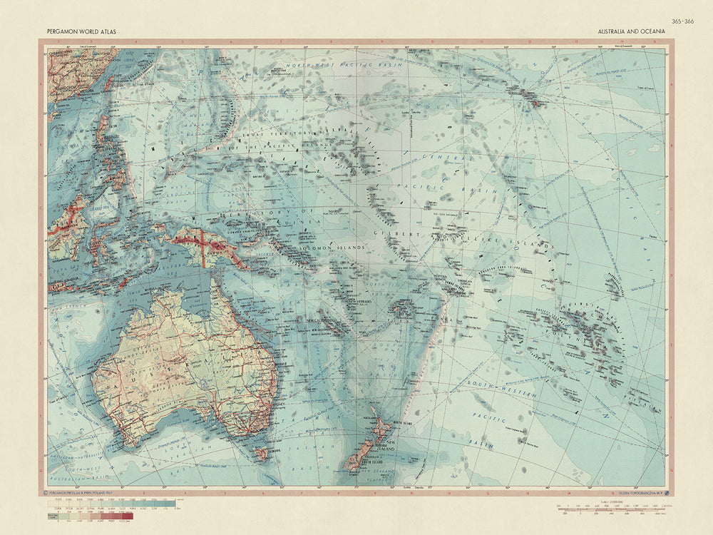 Plongez-vous dans les détails complexes de la carte 'Australie et Océanie', un témoignage époustouflant du savoir-faire cartographique du Service topographique de l'Armée polonaise, qui a été réalisé pour la première fois en 1967. Cette carte du monde, une représentation politique et physique détaillée, capture les vastes étendues de l'océan Pacifique et les masses terrestres qui ponctuent son étendue bleue. Les sujets de la carte s'étendent au-delà de l'Australie et de l'Océanie, atteignant aussi loin que Hawaï au nord-est, la Polynésie au sud-est, Hong Kong au nord-ouest, et Bornéo à l'ouest. Cette couverture expansive offre une vue d'ensemble de la région du Pacifique, permettant au spectateur d'apprécier l'échelle et la diversité de ces terres lointaines.