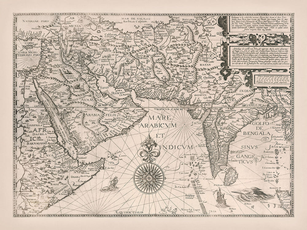 Une des caractéristiques les plus frappantes de cette carte est sa représentation détaillée des plans d'eau tels que la mer Méditerranée, la mer d'Arabie, l'océan Indien, le golfe du Bengale et le delta du Gange. L'inclusion de diverses chaînes de montagnes non nommées et de repères côtiers renforce encore sa précision géographique. La capacité de la carte à capturer à la fois les paysages physiques et politiques des régions qu'elle dépeint témoigne du savoir-faire cartographique de Linschoten.