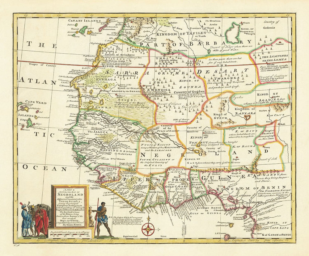 Mais pour la plupart, cette carte montre l'Afrique de l'Ouest à l'époque où elle était régie par les grands royaumes indépendants de Bénin, Juda, Tafilet (aujourd'hui le Maroc et l'Algérie), Agades, Zanfara et Bito.