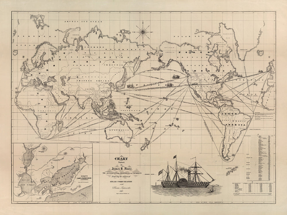 Carte du vieux monde des routes des bateaux à vapeur par James Moore, 1850
