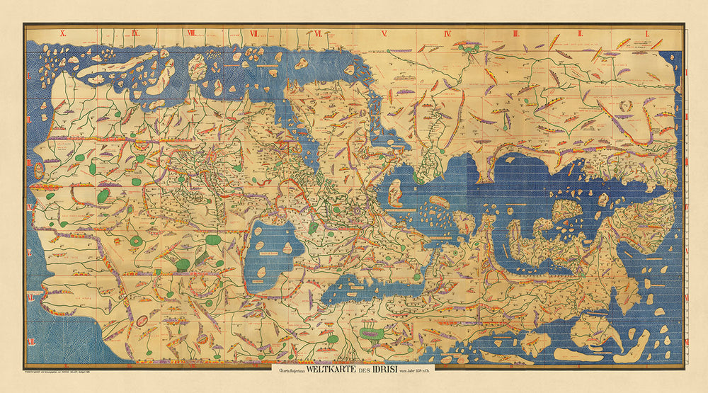 Embarquez pour un voyage à travers le temps avec la célèbre Charta Rogeriana, une carte du monde méticuleusement réalisée par le célèbre géographe arabe, Muhammad Al-Idrisi, en l'an 1154. Ce chef-d'œuvre, également connu sous le nom de Tabula Rogeriana, a été commandé par le roi normand Roger II de Sicile, encapsulant un monde bien au-delà des limites de la Méditerranée. Le travail révolutionnaire d'Al-Idrisi, basé sur des interviews approfondies avec des voyageurs chevronnés et la synthèse de connaissances fiables, représente une confluence de géographie, de climat et d'exploration, habilement décrite à travers des continents allant de l'Europe à l'Asie, et de l'Afrique à l'océan Indien. Cette carte thématique, avec son orientation unique du sud en haut, s'étend des côtes de l'Espagne à l'immensité de la Corée, traçant des terres à la fois connues et mystérieuses pour l'esprit médiéval.