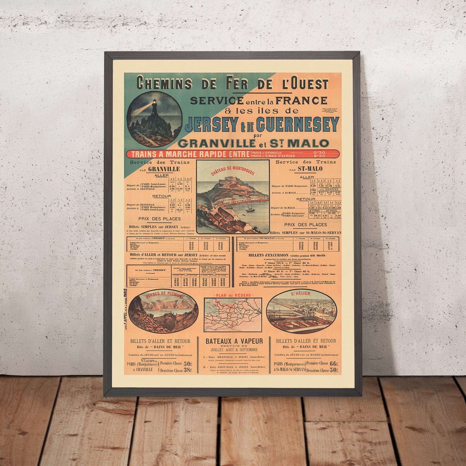 About the subject: the Chemins de Fer de l’Ouest network knit together Paris with Normandy and Brittany, and this poster highlights the coveted cross‑Channel connections to Jersey (St‑Hélier) and Guernsey via Granville and Saint‑Malo. You can see place names that resonate with travelers—Rennes, Dinard, and even Le Mont‑Saint‑Michel—making the piece especially meaningful for anyone who has strolled Saint‑Malo’s ramparts, sunned on Jersey’s beaches, or traced family ties in the Channel Islands. The text also notes coordination with British steamers (London & South Western Railway Company), a reminder of how seamlessly trains and boats once dovetailed.