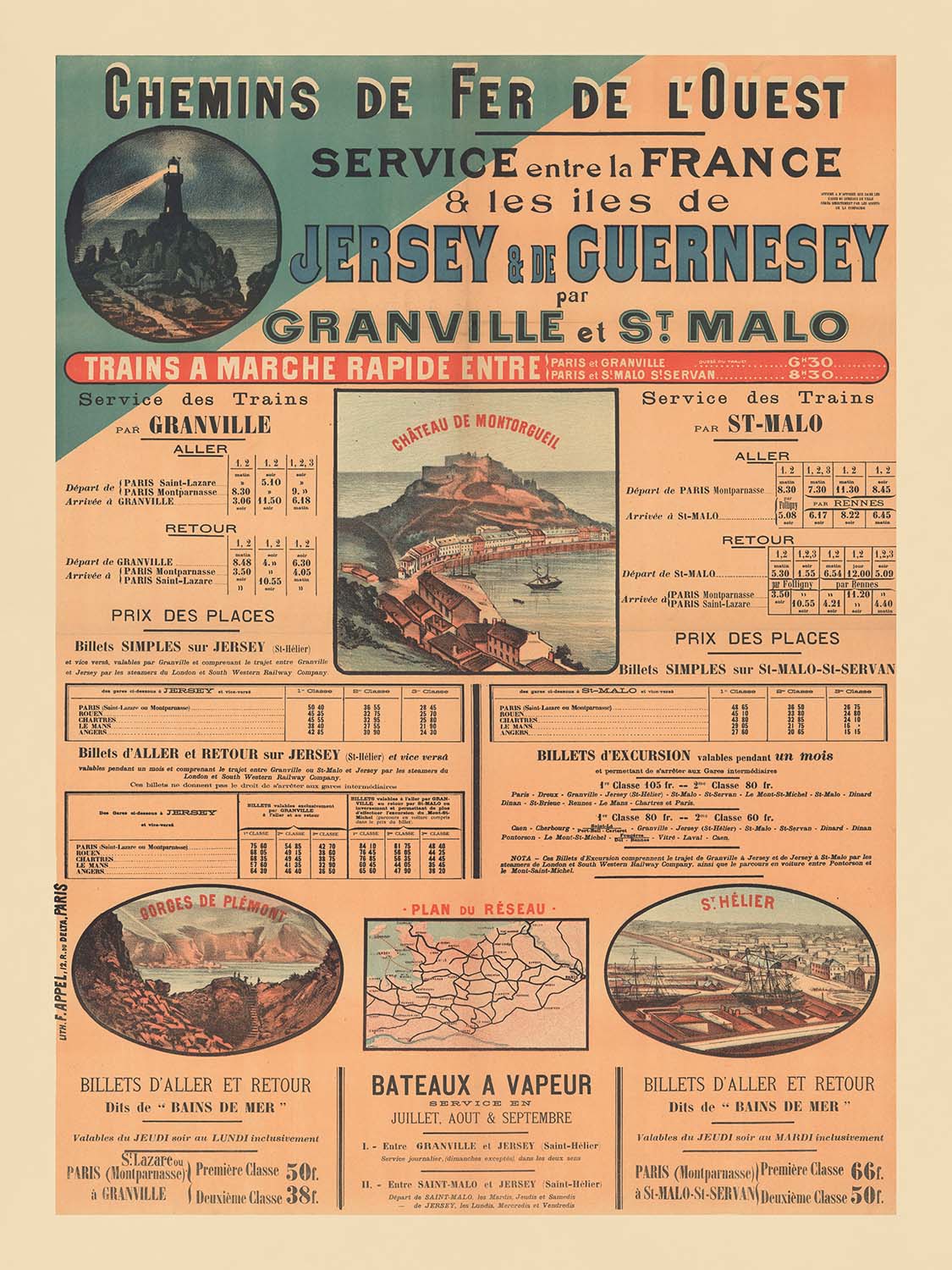 Chemins de Fer de l’Ouest. Service entre la France & les Îles de Jersey & de Guernesey par Granville et St Malo by Lith. F. Appel (1890) is a handsome Belle Époque railway and steamship poster that advertised rapid links from Paris to the Channel Islands via the Breton and Norman coasts. At the top, the bold headline “TRAINS A MARCHE RAPIDE” spans the page, followed by meticulously set columns listing departures from Paris Saint‑Lazare and Paris Montparnasse to Granville and Saint‑Malo, then onward by steamer to Jersey and Guernsey. Printed on a warm cream ground with crisp, dark type and punctuations of red for headings like “ALLER” and “RETOUR,” it’s a superb snapshot of the era when timetables themselves were objets d’art.