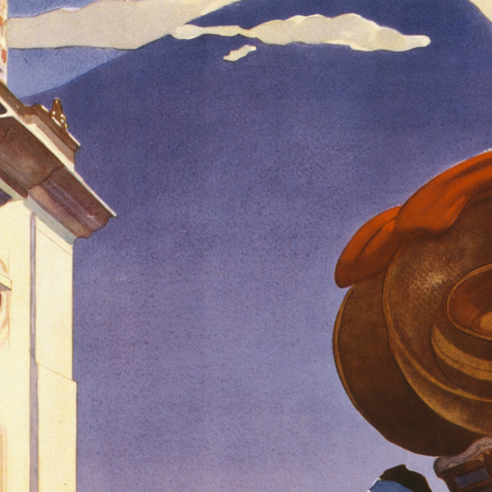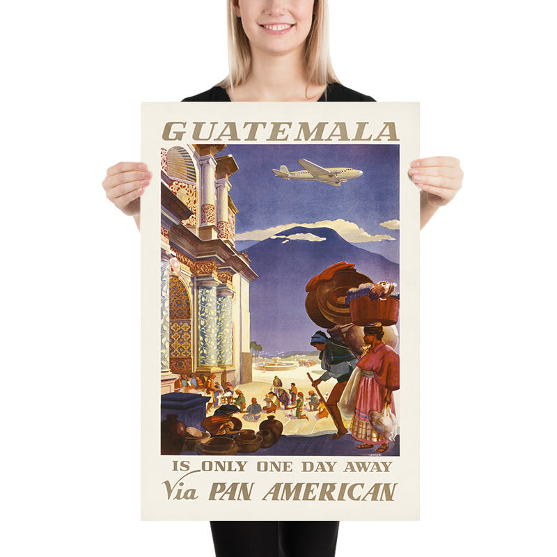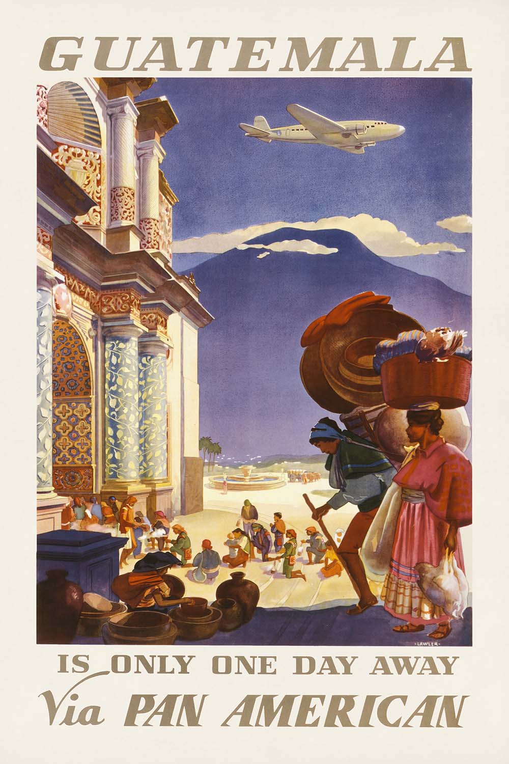 “Guatemala is only one day away via Pan American” by Paul George Lawler, first published in 1938, distills the romance of the Golden Age of Air Travel into a single, irresistible promise of speed and wonder. Lawler’s poster bridges modern flight with the textures of Guatemalan life: an airplane arcs above curvilinear mountains and colonial architectural motifs, while figures in traditional dress animate the foreground. The result is both invitation and atmosphere—an image that made distant landscapes feel vividly near, and a country’s cultural richness feel beautifully attainable.