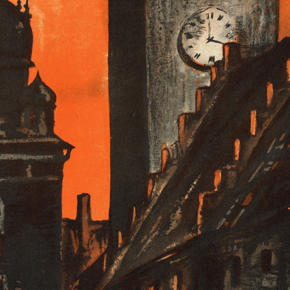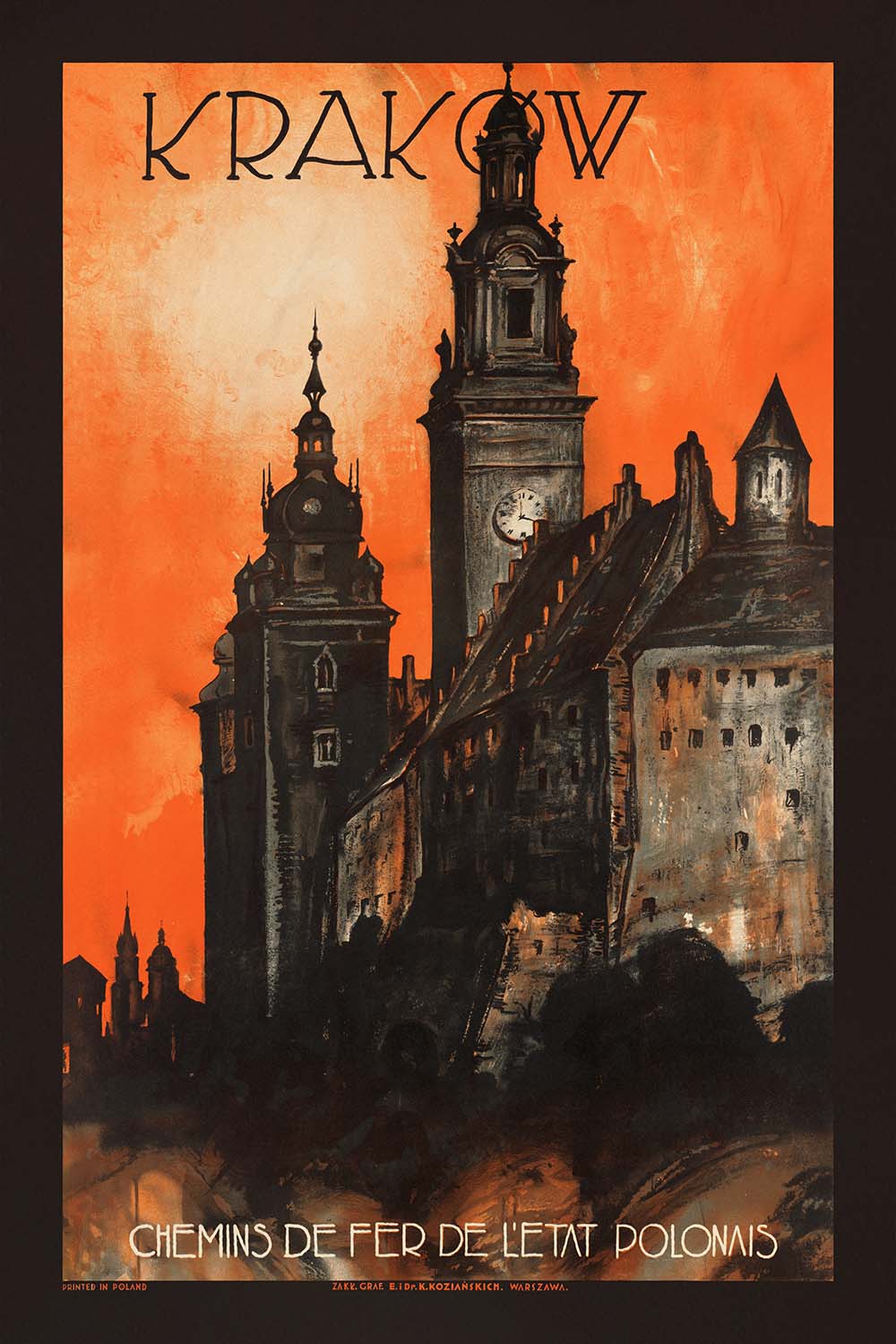 Style and color you’ll love: The composition’s saturated orange backdrop radiates warmth and energy, dramatically offset by deep black and earthy brown silhouettes that stage the skyline with theater-like intensity. Clean, geometric lines and strong verticals lend poise and structure, while the minimal, uncluttered layout conveys speed and modernity—hallmarks of Art Deco design. This balanced palette sits beautifully in contemporary interiors, mid-century spaces, and eclectic galleries alike, making it a compelling statement piece for anyone who loves travel, architecture, or Polish heritage.