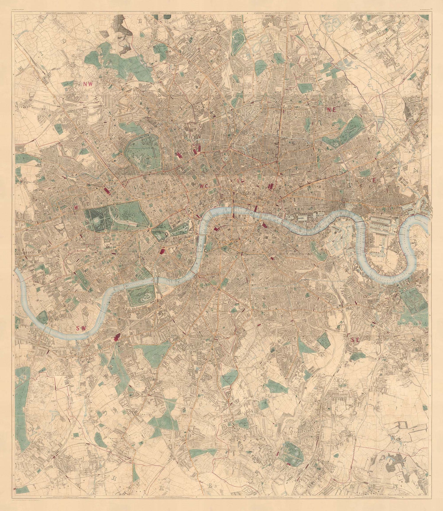 Imprimée à l'origine en 24 feuilles, c'est la carte ancienne de Londres la plus détaillée que vous puissiez trouver. Presque chaque habitation de Londres est dessinée sur cette carte - et considérant qu'il y avait environ 3 millions de personnes vivant à Londres dans les années 1860, c'est beaucoup d'habitations.