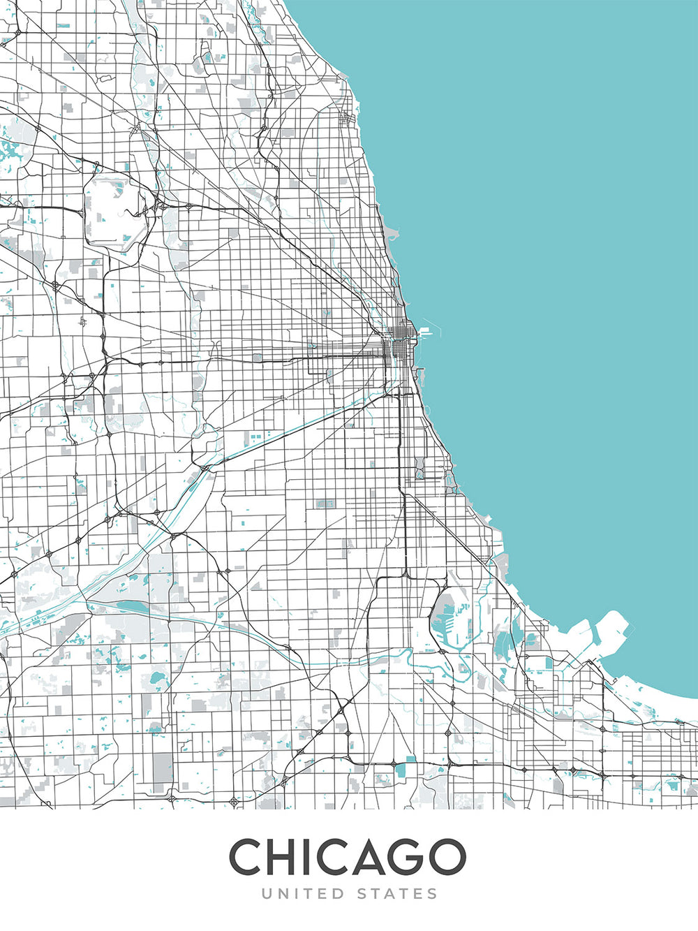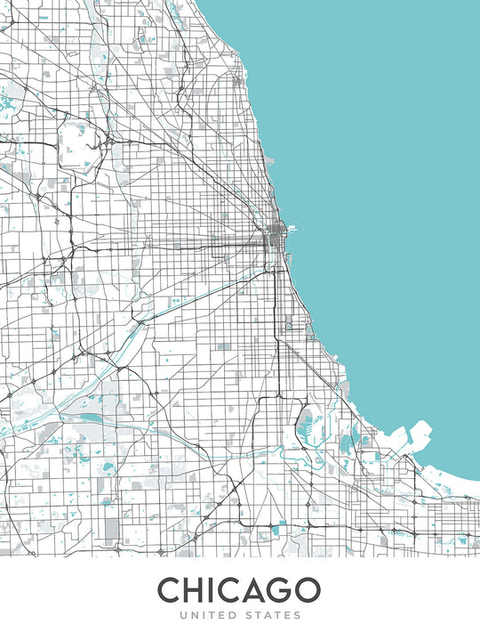 Cette carte de Chicago est une carte moderne et détaillée des rues sans étiquettes, se concentrant sur la ville de Chicago et ses environs dans l'Illinois. La carte couvre une zone substantielle, offrant une vue extensive de la ville et de ses divers quartiers, villes et monuments. La zone géographique rectangulaire capturée par la carte offre une exploration complète du paysage urbain de Chicago, en faisant un élément idéal pour ceux qui s'intéressent à la géographie et à l'urbanisme de la ville.