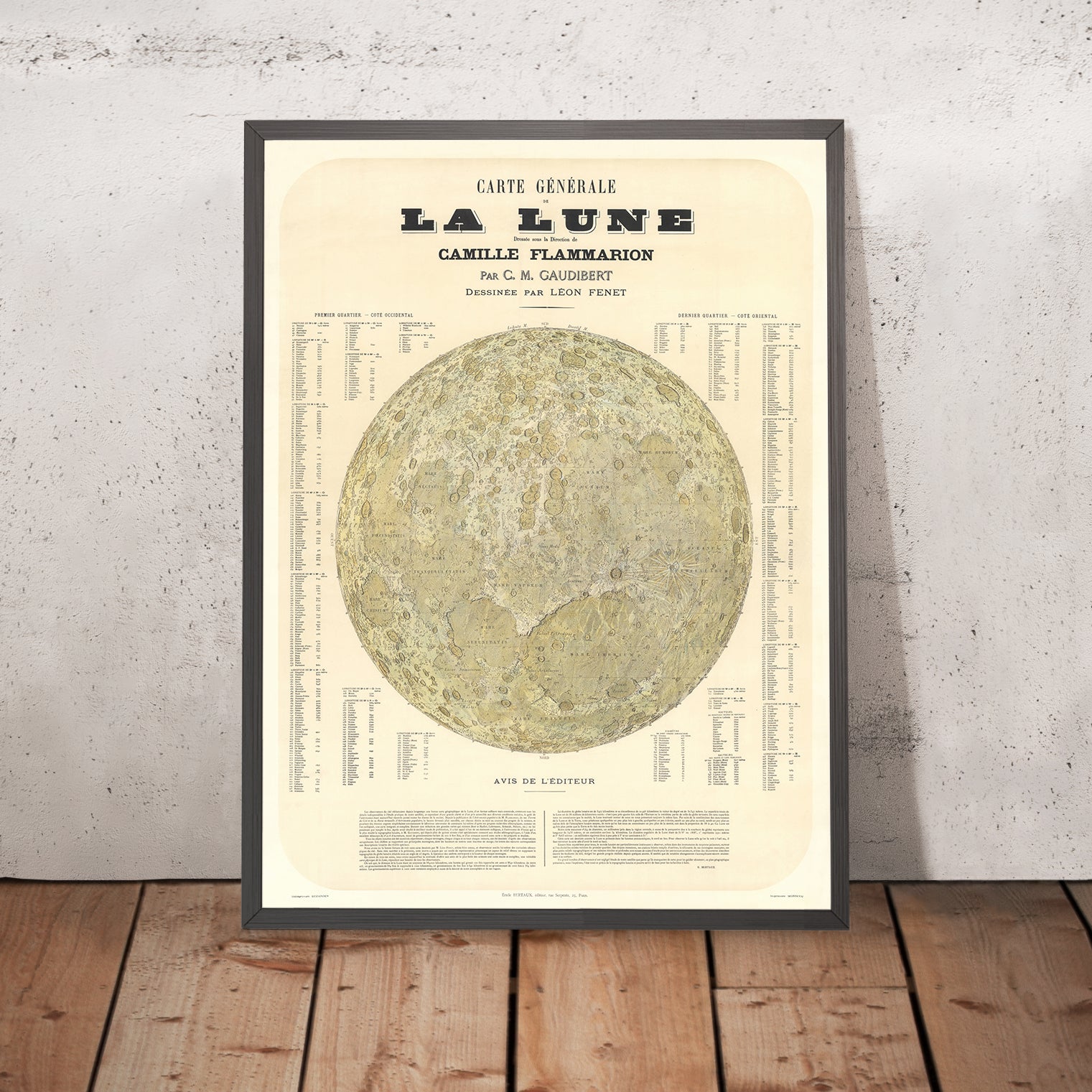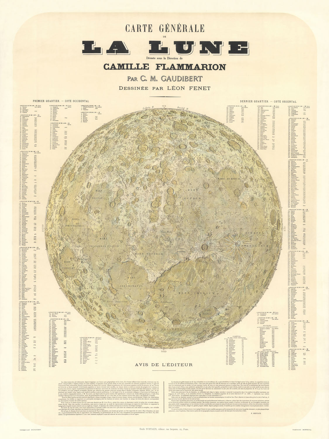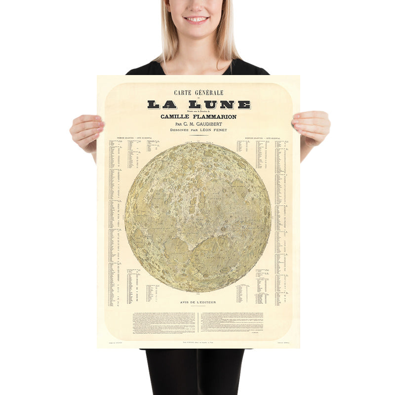 Carte Général de la Lune (1877) est un portrait marquant de la Lune qui marie observation rigoureuse et élégance du dessin. Conçue sous la direction de l’astronome renommé Camille Flammarion et fondée sur plus de 15 ans d’étude nocturne de Casimir Marie Gaudibert, elle cartographie la face lunaire avec une clarté et une assurance peu communes. Le sujet central de la carte est la géographie lunaire — un recensement minutieux des bassins, des maria et surtout des cratères —, encadrée par un programme infographique raffiné qui rend la sélénographie complexe accessible d’un seul coup d’œil. Son intérêt durable tient à l’équilibre qu’elle atteint : la précision d’un document scientifique associée à la séduction visuelle de la gravure du XIXe siècle, une fusion qui valut à l’œuvre une reconnaissance dans les cercles scientifiques contemporains.