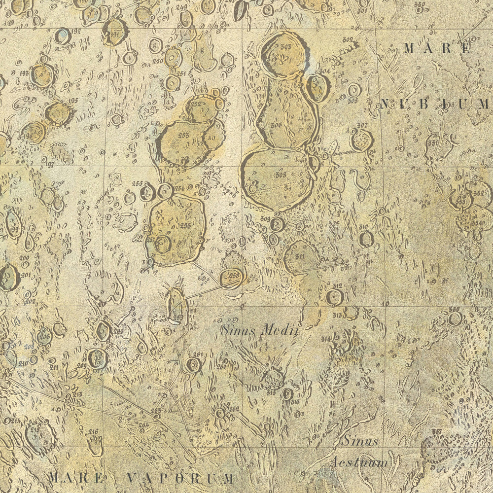La composition récompense une lecture attentive. Des repères emblématiques tels que Tycho et Copernic ancrent probablement les hautes terres méridionales et centrales avec leurs systèmes de rayons lumineux, tandis que des maria sereinement ombragés — dont le célèbre Mare Tranquillitatis — forment des plaines veloutées qui tempèrent le drame d’un relief plus marqué. Autour d’eux, des remparts cratérisés concentriques, des fortifications interrompues et de faibles rilles se révèlent par un clair-obscur nuancé, permettant aux spectateurs de déduire l’âge relatif et l’histoire de l’érosion. Le rythme des légendes de la carte invite à l’exploration : les éléments majeurs appellent une typographie plus grande, tandis que les notations secondaires se glissent en murmure le long de la périphérie des bassins et des dômes. Ce qui commence comme un seul visage lunaire se déploie en un récit stratifié d’impacts, d’engloutissements et de temps lent gravé dans la pierre.