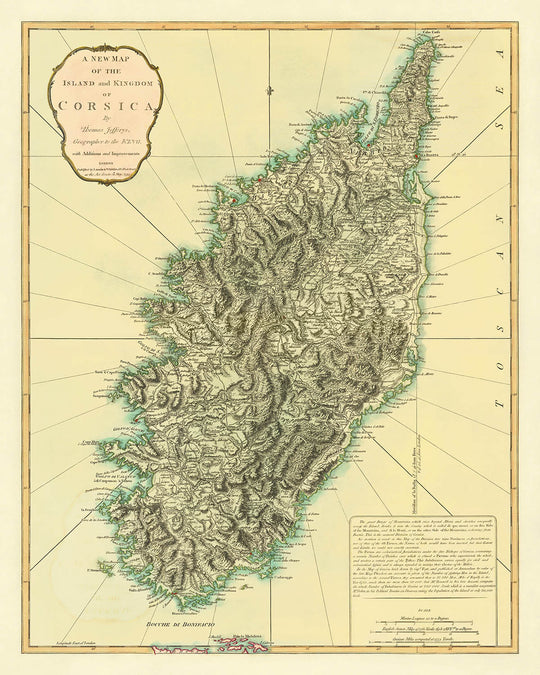 En tant que carte de pays, 'Une Nouvelle Carte de l'Île et du Royaume de Corse' offre une perspective unique sur la géographie et l'histoire de la nation. La représentation détaillée de la topographie de l'île, combinée aux frontières politiques et à l'infrastructure, fournit un aperçu complet de la Corse. Cela rend la carte non seulement un outil précieux pour comprendre la géographie de l'île, mais aussi un document historique fascinant. L'accent mis par la carte sur les aspects physiques et politiques de l'île offre une vue holistique de la Corse, en faisant une pièce intéressante et précieuse pour tout passionné de cartes ou amateur d'histoire.