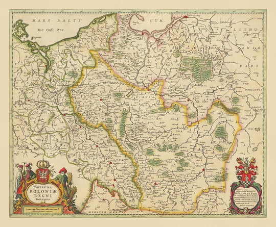 Cette belle ancienne carte de Jan Jansson montre la Pologne, l'Allemagne, la Prusse et d'autres parties des États baltes en 1640.