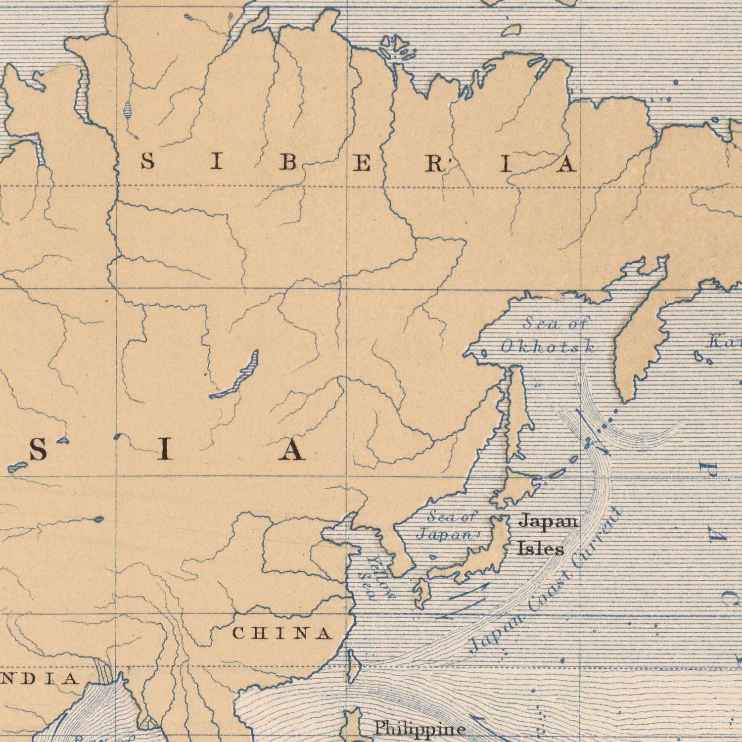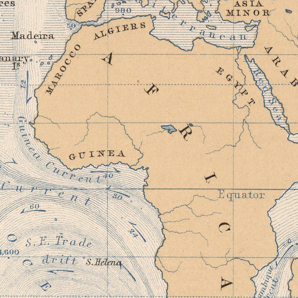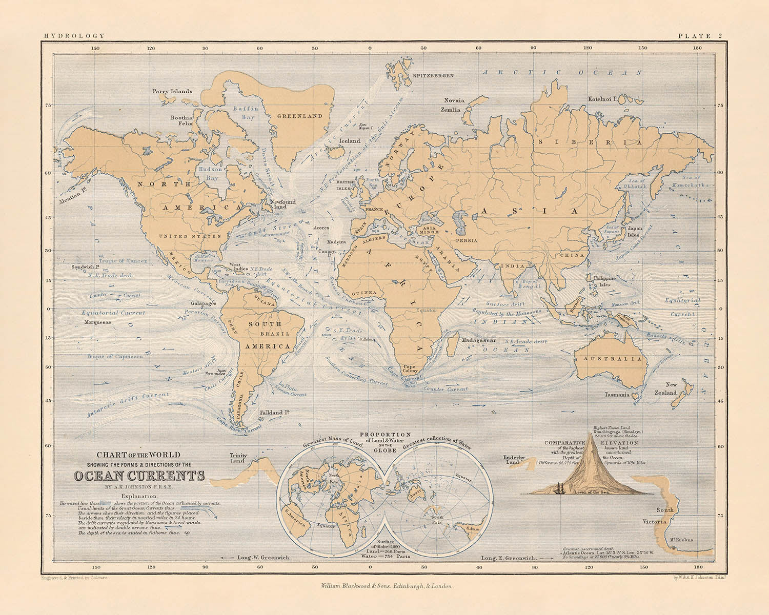 Publiée à un moment où les clippers poursuivaient les vents saisonniers et où la vapeur commençait à renégocier le temps océanique, la carte de Johnston cristallise le tournant scientifique de son époque — sobre, comparative et d’envergure mondiale. Publiée par Blackwood & Sons, dont les presses ont diffusé le Physical Atlas dans des bibliothèques et cabinets à travers la Grande-Bretagne et au-delà, elle incarne l’union victorienne du beau et de l’utile. Aujourd’hui, elle se lit à la fois comme un artefact de la cartographie thématique pionnière et comme une carte des systèmes étonnamment moderne : un élégant schéma des courants qui continuent de structurer notre météo, de guider nos navires et de relier les continents entre eux.