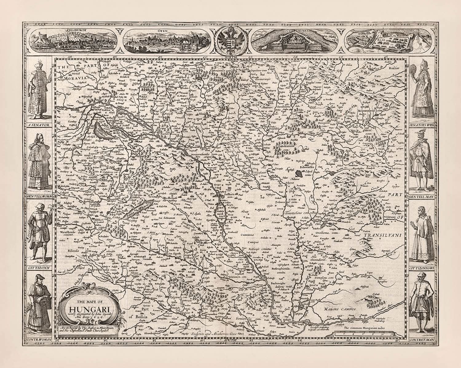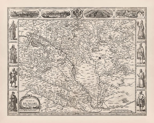 Cette carte illustre de manière vivante les régions de Hongrie, de Moravie, de Transylvanie et de Bohême, capturant l'essence de ces régions avec une précision remarquable. Les frontières politiques sont soigneusement délimitées, offrant un aperçu du paysage géopolitique de l'époque. Le relief est représenté avec art au moyen de croquis, mettant en évidence la topographie diversifiée qui définit cette partie de l'Europe. L'attention portée par Speed aux détails s'étend aux illustrations complexes de personnages locaux en tenue traditionnelle, ajoutant une dimension culturelle à la représentation géographique.