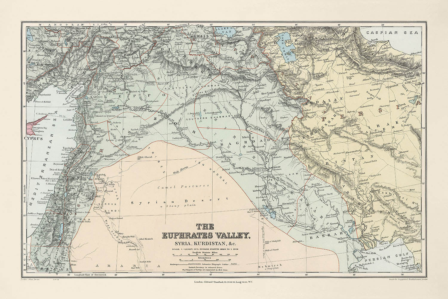Topographically, Stanford’s hachures do more than shade hills; they narrate movement and constraint. The map renders the Taurus and Anti-Taurus as formidable walls, funnels traffic through passes into the Cilician plain, and spreads the Jazira plateau between the Euphrates and Tigris like a broad stage for seasonal migrations and grain caravans. Desert tracts are named and bounded, emphasizing the thresholds between settled riverine belts and arid expanses. River meanders at Raqqa and Deir ez-Zor, the channels and islands of the lower Euphrates, and the approach toward the Tigris near Mosul and Kirkuk are shown with hydrographic precision that recalls the region’s ancient irrigation cultures and the enduring strategic value of water.