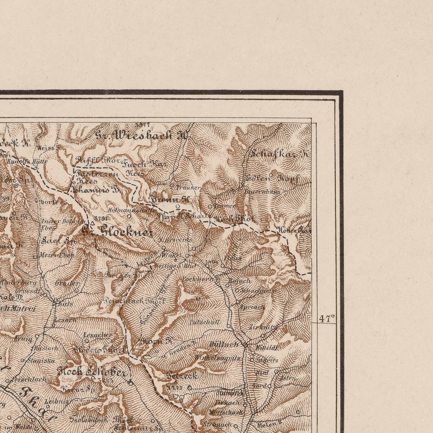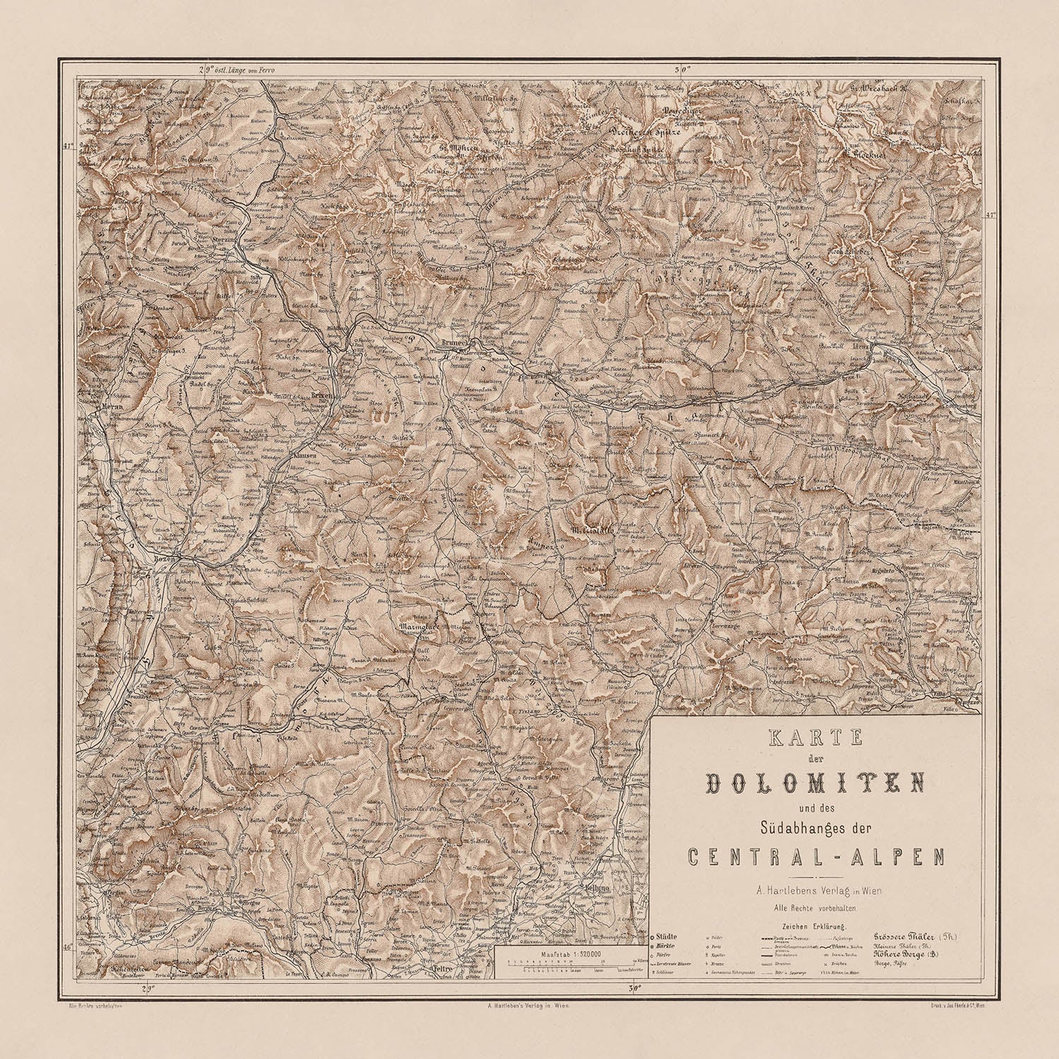 Alois Hartleben’s 1880 Karte der Dolomiten und des Südabhanges der Central-Alpen captures the vertical drama of the Dolomites and the southern ramparts of the Central Alps with uncommon clarity. The composition spans from Bozen on the western edge to Tolmezzo in the east, with Feltre at the southern threshold and the Großes Wiesbachhorn anchoring the north—an elegant frame for a landscape in motion. Finely stepped elevation contours combine with expressive shaded relief to articulate serrated ridgelines, amphitheater-like cirques, and the decisive corridors of valleys and passes. Major ranges, key saddles, and landmark summits are crisply labeled, while a lattice of trails and routes threads together market towns, spa resorts, and alpine hamlets, revealing how movement, commerce, and culture negotiated this demanding terrain.