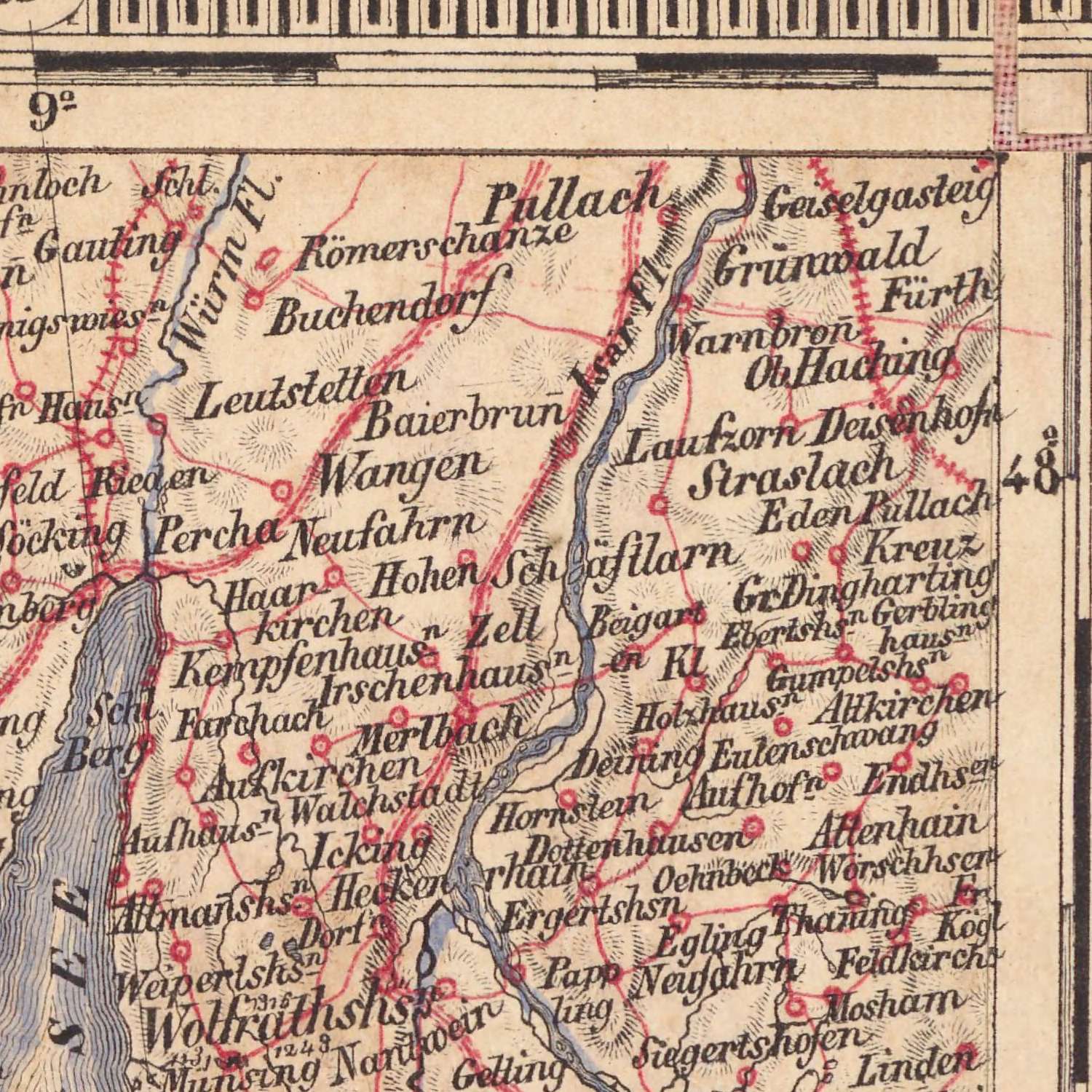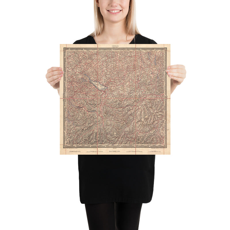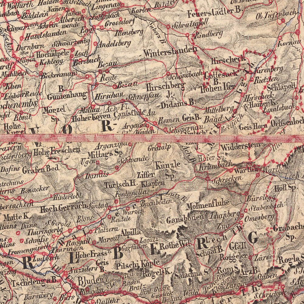 Woerl’s mastery lies in his early, assured use of two-color lithography. A red lithographic stone, overlayed with exceptional precision, brings instantaneous legibility to roads, emerging railways, and political separations, while black delineation does the work of names, contours, and hydrography. Relief is modeled with disciplined hachures that render the Black Forest’s serried slopes and the Alps’ approaching buttresses with tactile nuance. Bathymetric engraving gives Bodensee a living contour, echoing the passage of the Rhine across the basin. This modern printing sensibility—spare, functional, and beautiful—explains the map’s esteem among contemporary users and its later adoption by the German army, which prized such clarity for planning and reconnaissance.