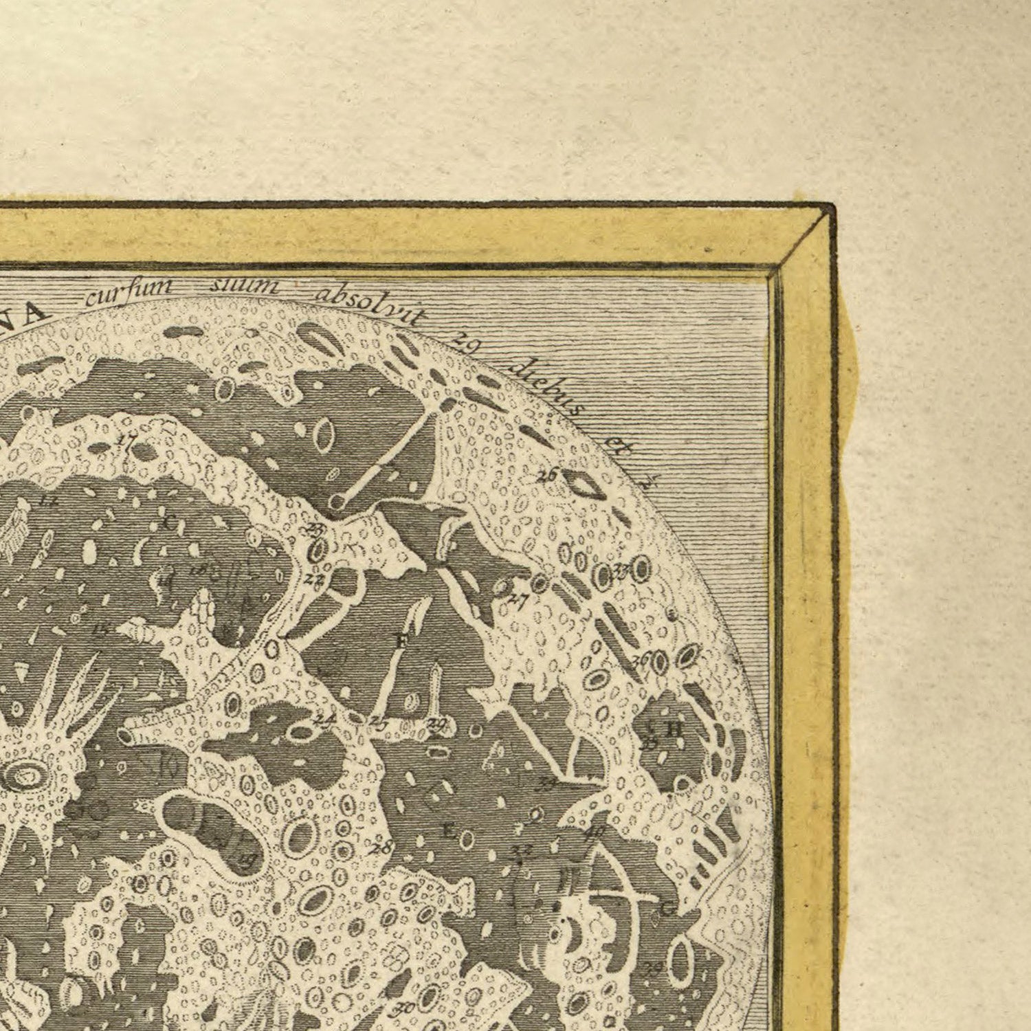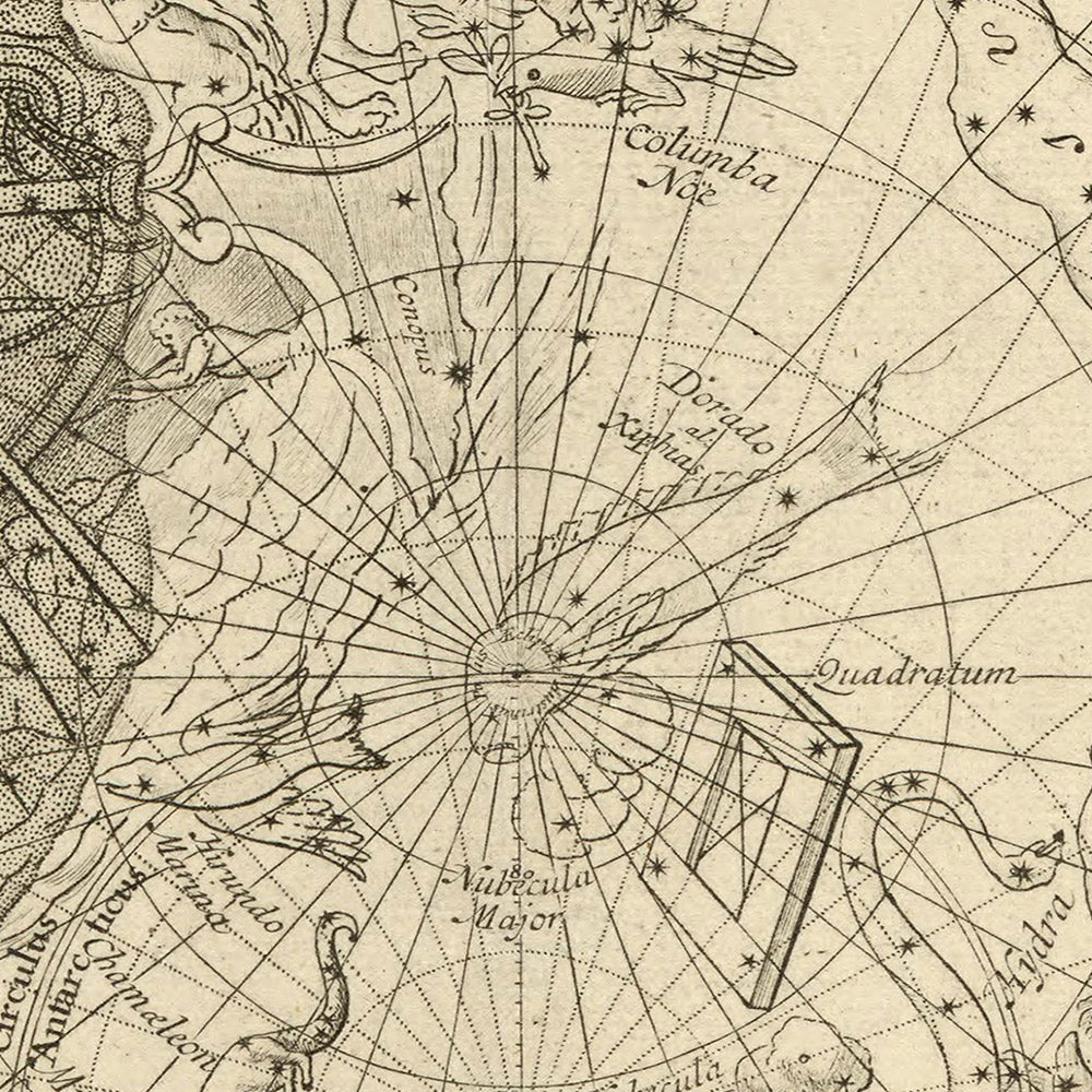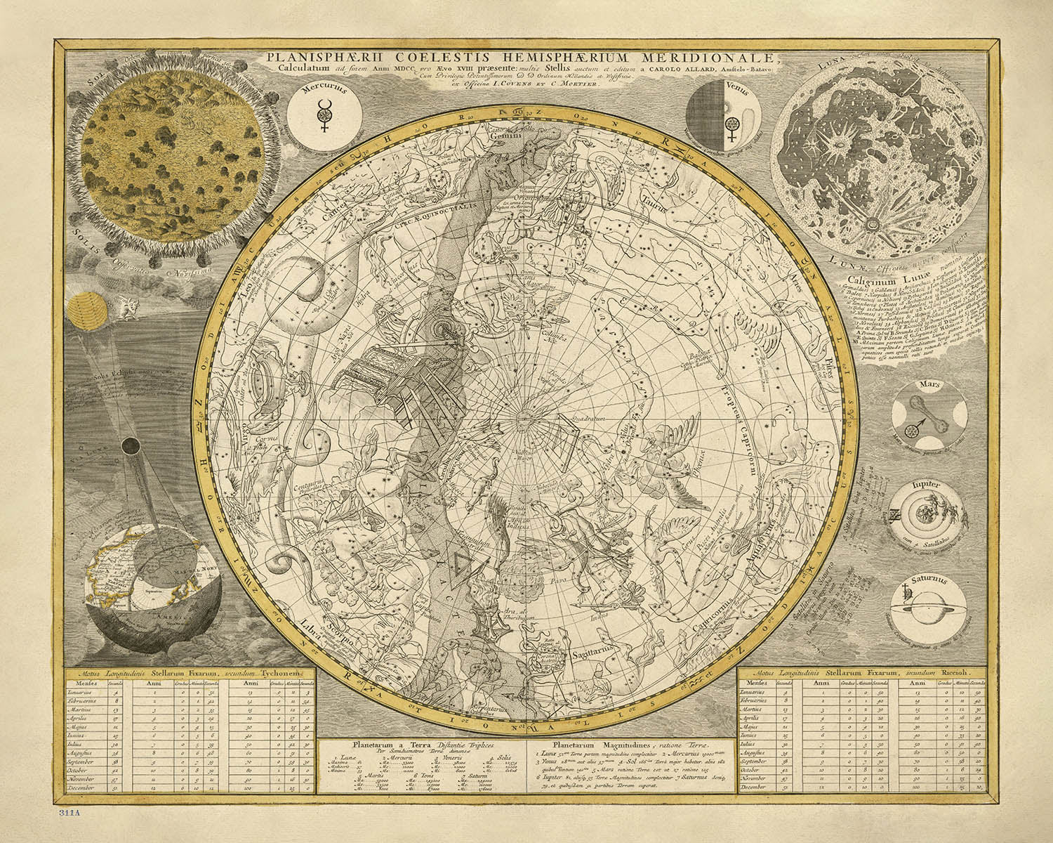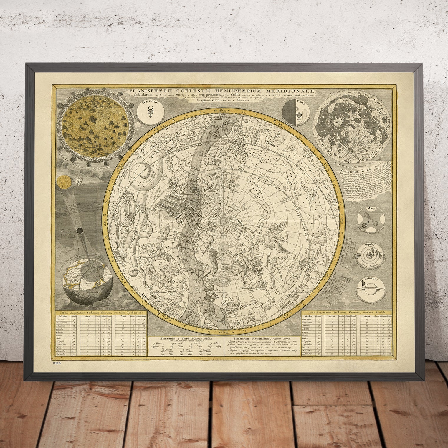 About the chart: This southern-hemisphere planisphere was designed for navigators, astronomers, and curious readers at a time when exploration of the southern seas was reshaping Europe’s understanding of the sky. The constellation figures are shown as mythic creatures and instruments surrounding the star field, while inset diagrams and tables record timely astronomical observations: recent solar phenomena, the appearance of the Moon, and notes on the visible planets (Mercury, Venus, Mars, Jupiter, and Saturn). Together, these elements reflect a period when celestial mapping served both practical navigation and learned study.