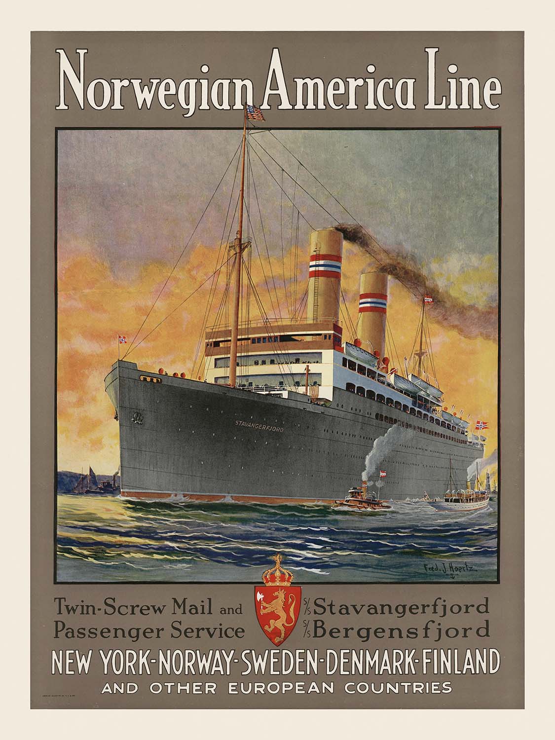 Why this poster matters: Norwegian America Line connected Norway’s principal ports with New York during a transformative era of migration and leisure travel. The “Stavangerfjord,” depicted here, stood for reliability and elegance, linking families, commerce, and cultures across the Atlantic. Hoertz’s 1924 design distills that narrative into a single view—one that resonates with Norwegian heritage, transatlantic history, and the optimism of travel between Old World and New.