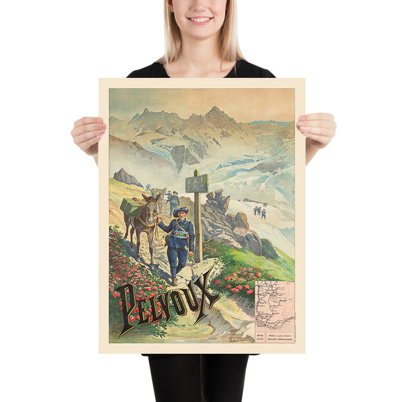 The subject here is the Pelvoux massif in southeastern France, a magnet for mountaineers and nature-seekers in the age when rail made the Alps newly accessible. PLM’s travel posters were cultural touchstones, transforming distant peaks into attainable escapes. In 1895, destinations like Pelvoux embodied the modern ideal of outdoor leisure—crisp mountain light, clean air, and the thrill of paths leading to the unknown.