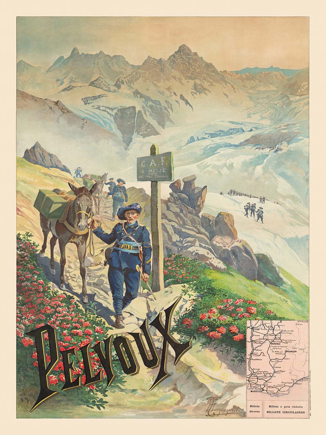 P. L. M. Pelvoux by Henri Ganier (1895) beckons travelers to the high drama of the Dauphiné Alps, capturing the romance of late 19th-century mountain tourism. Created for the Paris–Lyon–Méditerranée (PLM) railway, the poster frames the Pelvoux massif as a place of fresh air and grand horizons: a flowering alpine meadow in the foreground, human figures and a horse poised for ascent, and snow-bright peaks rising into a soft blue sky. It’s a quintessential Belle Époque invitation—part adventure promise, part daydream.