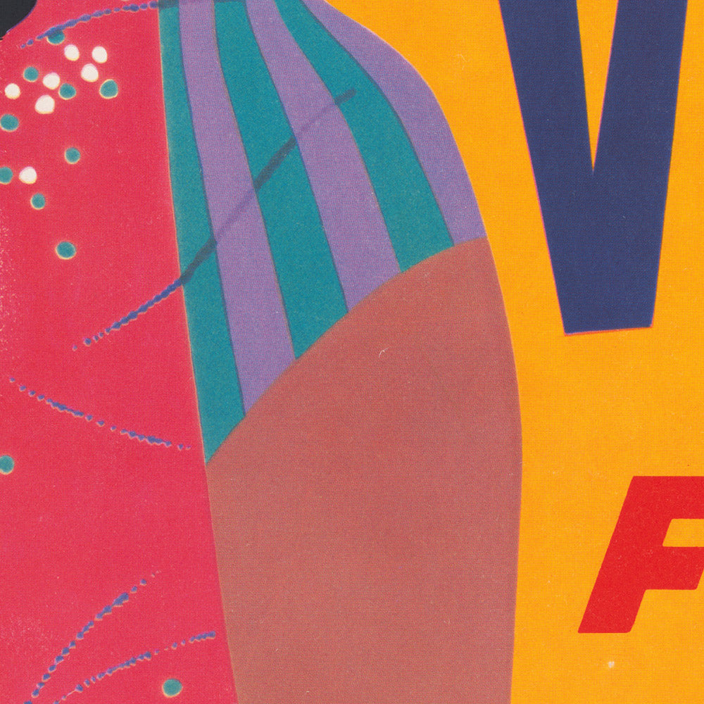 Klein’s design language is unmistakable here. A radiant palette led by yellow, with cool blue and playful pink accents, conjures desert light and night-life pop. Clean black outlines and smooth, fluid strokes keep the composition sleek and legible from across the room. Geometric and organic shapes—circular dice and card motifs, a stylized sun in sunglasses, cherries, and a central figure in a glamorous pose—layer into a lively, balanced arrangement. The interplay of bright complements and negative space channels classic Mid-Century Modern clarity, making this print a striking anchor for contemporary, vintage, or eclectic interiors.