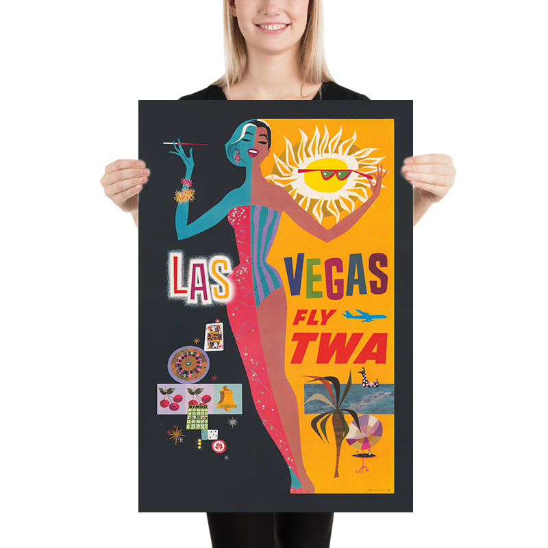 This Las Vegas poster embodies a key cultural moment: postwar prosperity, jet-powered tourism, and the magnetic rise of the Strip. Commissioned as part of TWA’s destination campaign, it fuses airline allure with the city’s heady promise of entertainment. For anyone who has strolled beneath the neon, tried their luck at the tables, or lounged by a desert pool, the image is both invitation and souvenir—an emblem of carefree escape in an era that prized speed, sunshine, and spectacle.