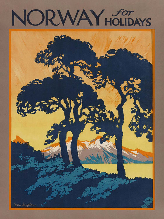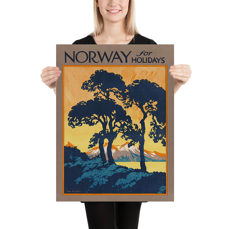 The poster is a classic of travel promotion, created when Norway’s growing network of steamship routes, scenic rail lines, and mountain hotels was opening the country to international visitors. Rather than pinpoint a single destination, it evokes the nation as a whole: towering peaks, dark conifer stands, and expansive water bathed in a golden‑orange glow. The promise is elemental—clean light, space, and a restorative landscape—which is precisely what has drawn travelers to Norway for generations.