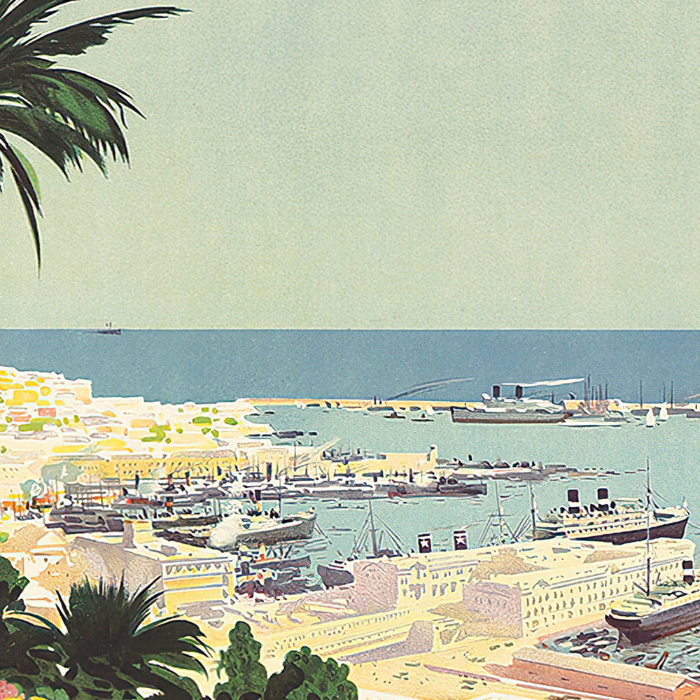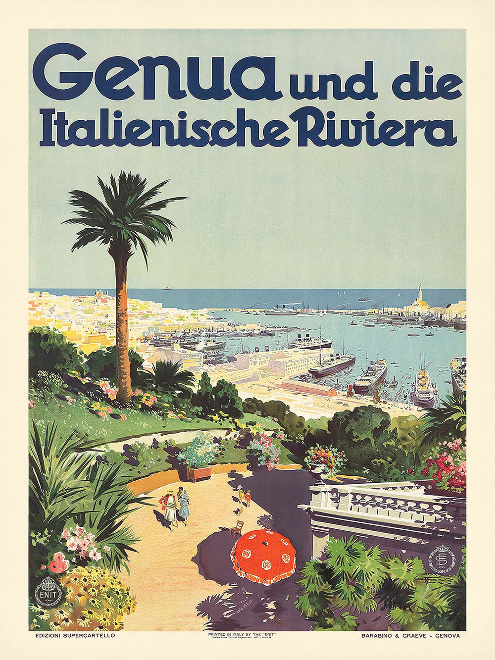 This poster captures a pivotal moment when railways and ocean liners opened the Riviera to a broader public. Genua celebrates Genoa’s unique character: terraced hillsides tumbling toward a deep natural harbor; promenades fringed with lush greenery; and an urbane seaside lifestyle that promised sunshine, elegance, and effortless mobility. Issued during the optimistic 1920s–30s travel boom, it embodies the spirited marketing that helped define Mediterranean tourism for generations.