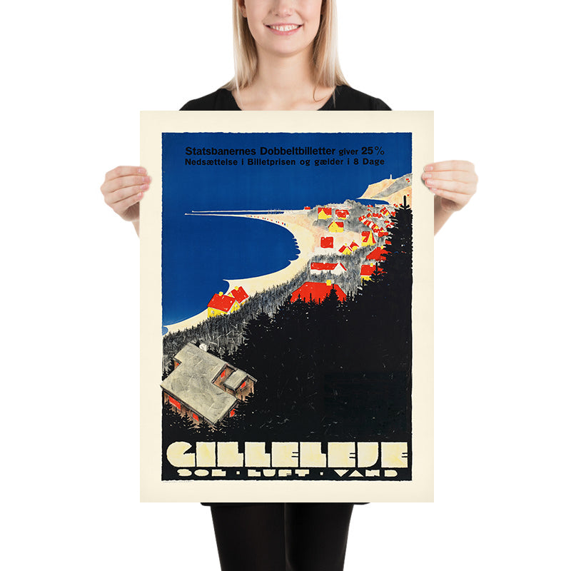 Gilleleje is a vintage Danish travel poster celebrating the northernmost town on the island of Zealand—where sandy beaches and a working harbor meet the open waters of the Kattegat. Created by an anonymous studio artist, it reflects the confident visual language of early 20th-century Scandinavian design: simplified forms, modernist geometry, and a clear sense of destination. The composition leads the eye along the shoreline cottages toward a calm horizon, evoking the breezy allure of Denmark’s famed “Danish Riviera” and the leisurely holidays that drew visitors to North Zealand.