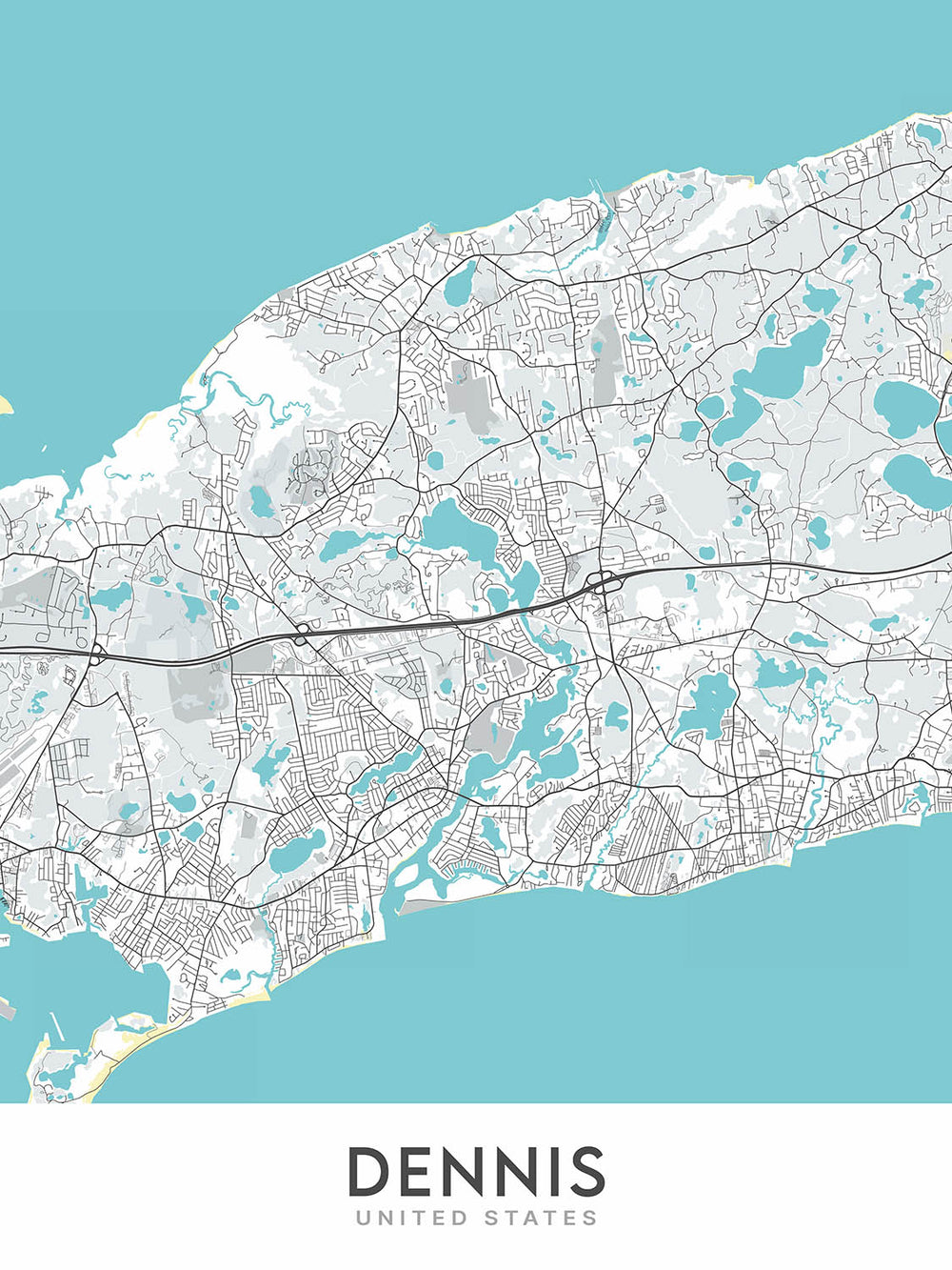 Mappa della città moderna di Dennis, MA: Villaggio di Dennis, East Dennis, Dennis Port, West Dennis, South Dennis