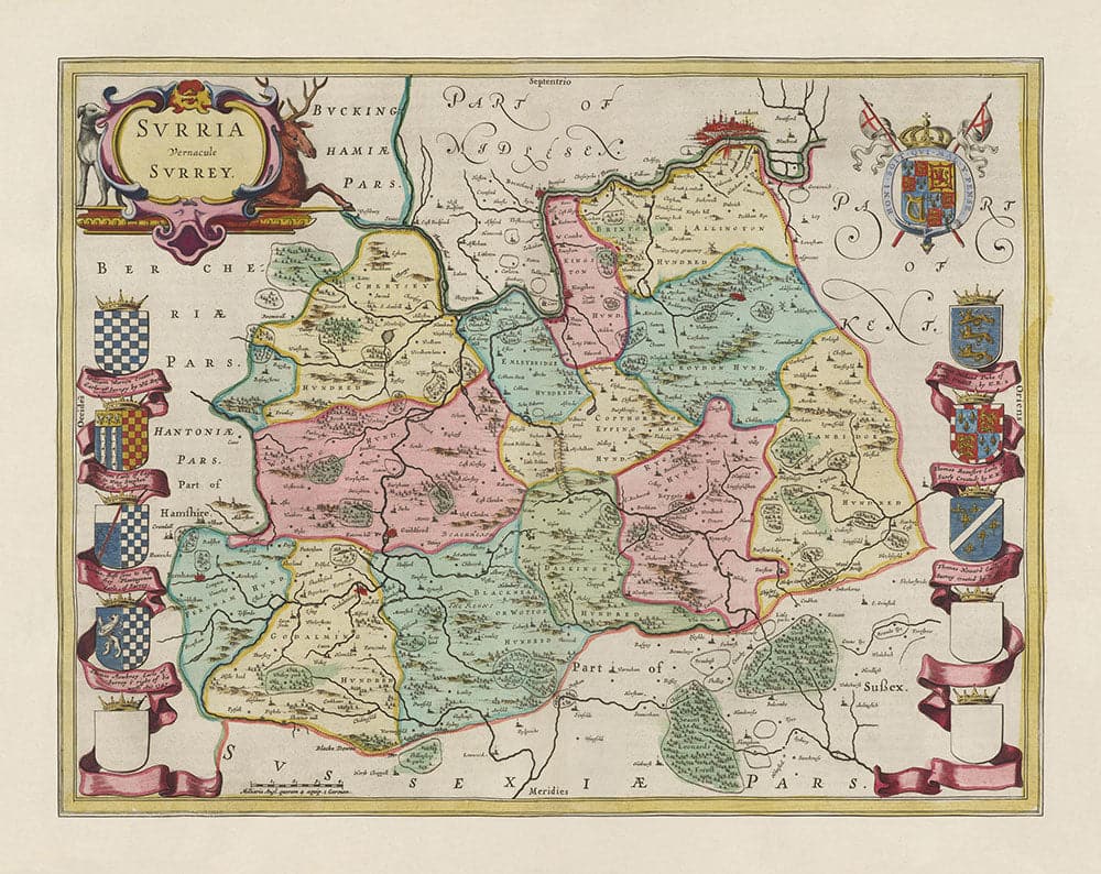 Mappa antica del Surrey nel 1665 di Joan Blaeu: Woking, Guildford, Croydon, Richmond, Kingston, Reigate